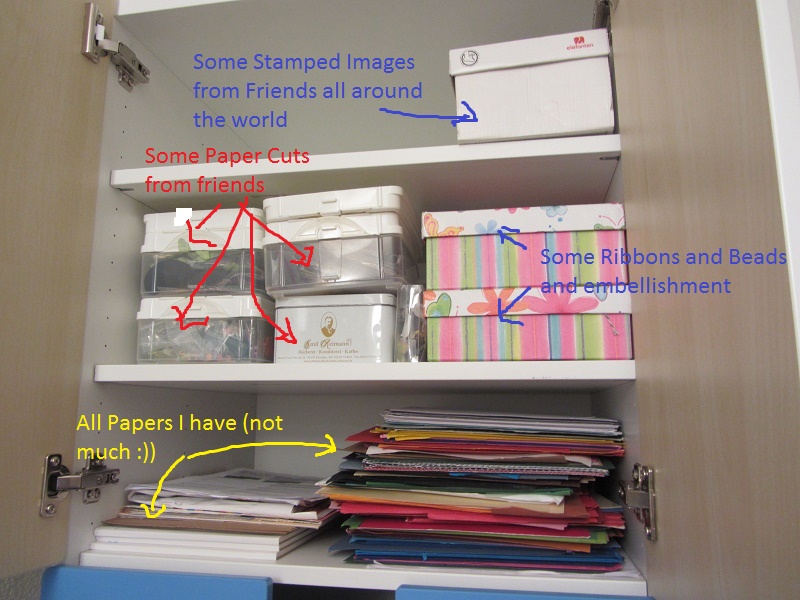 The Door at the top is full with images I got from friends from all around the world (we did RAK exchange Images), some DIe Cutting Paper from friends, some embellishment, ribbon and beads and the collection of papers I have.
