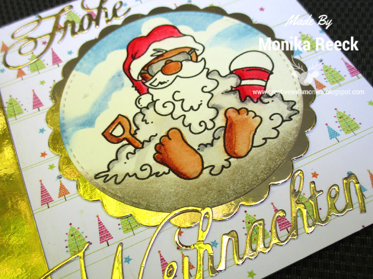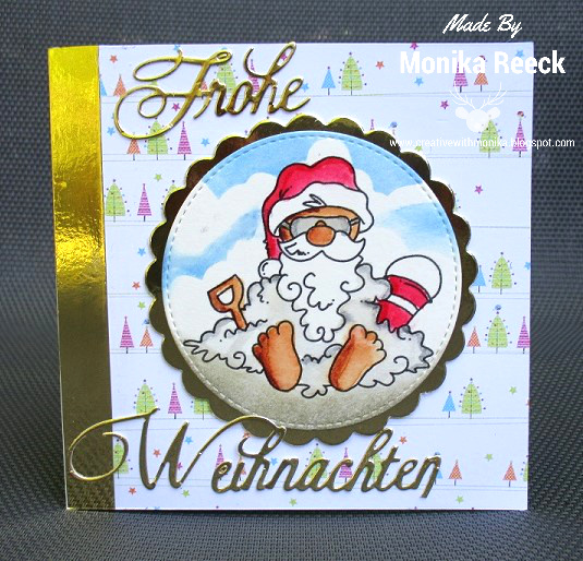 I really love this cute Santa with the sand Image from Bugaboo, I printed it on a white paper, die cut with Circle DIE and colored with Akashiya SAI Watercolor marker. Took a gold paper and make scallop with it and also cut the sentiment with Die cutting machine. I took the very old collection (2009) of DP I ever bought :) .The sentiment is German words mean Merry Christmas.