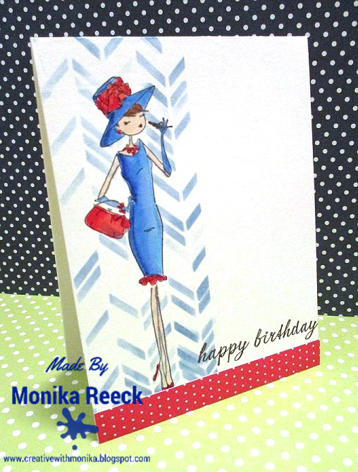 So many red, white and blue challenge out there :) This time is not patriotic card but I used that color combo on my Audrey Card. I started to colored it with Akashiya SAI and the skin is colored with Copic marker.