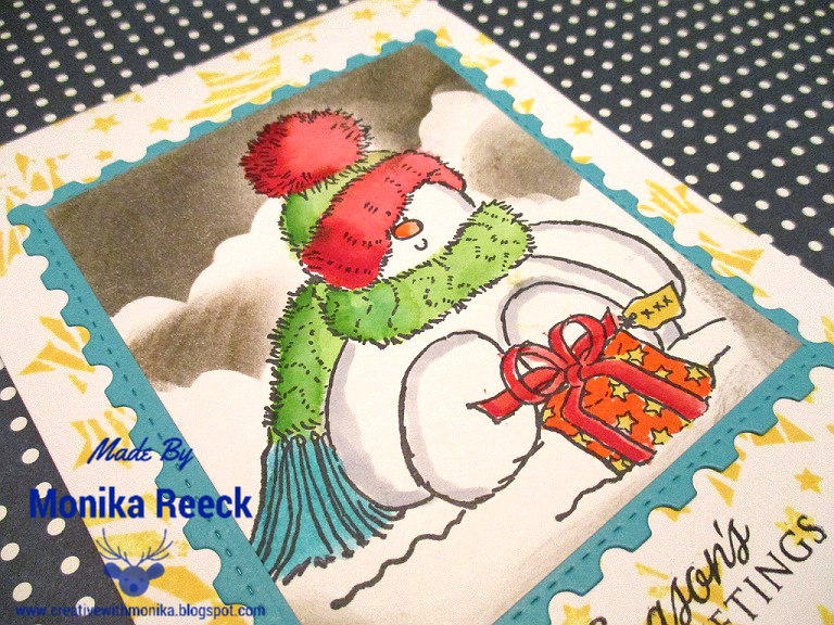This Rudolph was a Freebie Friday last year on Bugabooo shop...I printed it on a white paper, die cut with TAG DIE and colored with Akashiya SAI Watercolor marker. I stamped two christmas tree behind him and cut the bottom part and gave stripes paper as his ground.